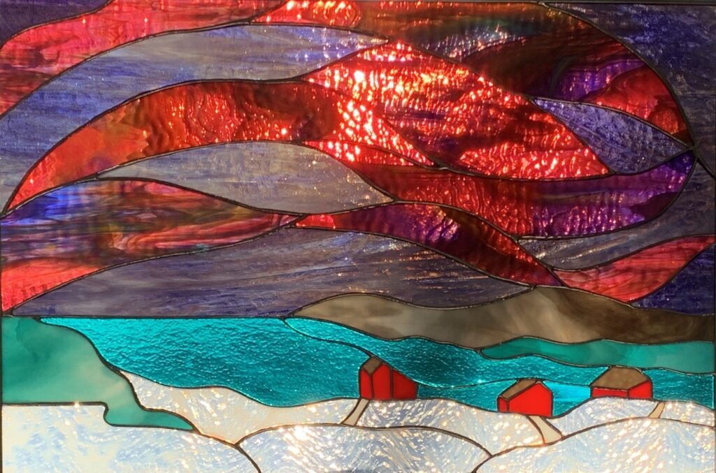 I’ve been wanting to portray the northern lights for a long time. When this beautiful cranberry ripple glass presented itself, I knew it was time. The colour of the water is due to silt deposits from the mountains and the little red houses are drawn from my memories of Sweden.