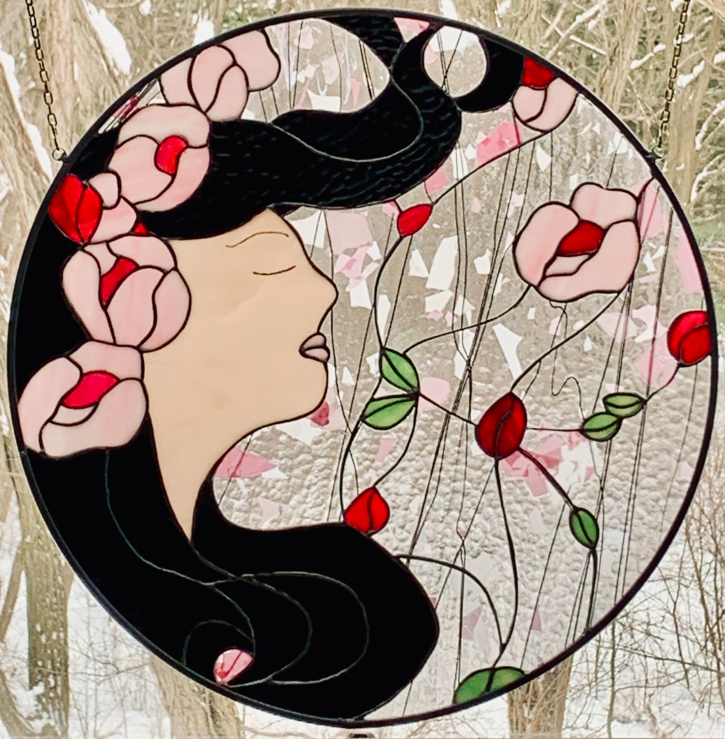 In the final season of 2025, I became enamored with pink. “She was of the Roses” is a sister panel to “I Dreamt of Roses”, with the same glass, but a strong, confident woman, at peace in her rose garden. I can almost hear her breathe, and when I look at her, I’m entranced by a complete and total sense of peace.