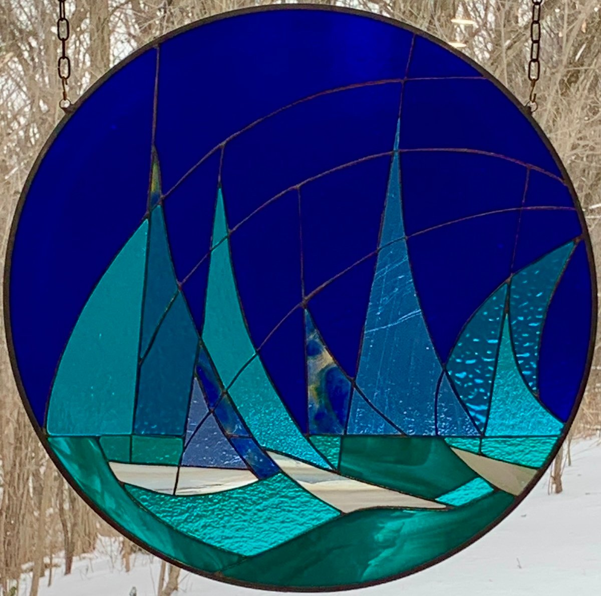 “The Regatta” came out of nowhere. I was wanting to do something in blues and a voice in my head kept telling me to work with sailing. What came out were lines of movement and sails and a multitude of blues that blended perfectly with summer skies and waters.